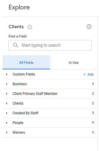 - On the left hand side, there is a search bar to locate and select additional data fields for your customized report.