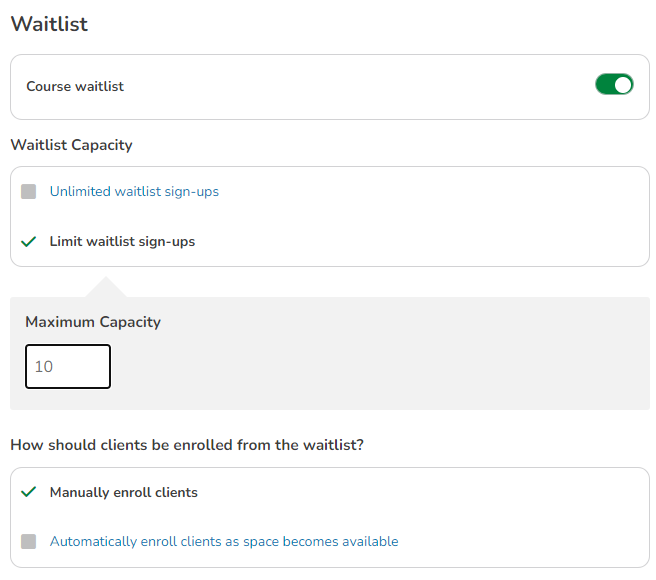 If enabled, the client at the top of the list is automatically moved to "Enrolled" and charged if a spot opens before the cutoff time.