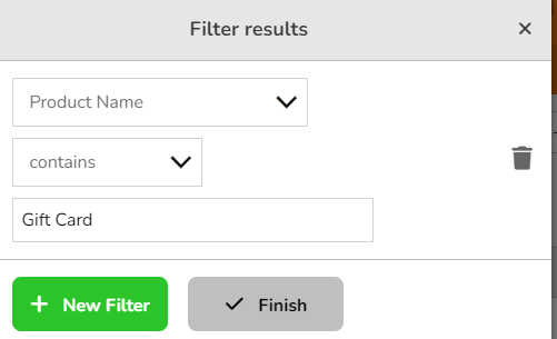 For businesses offering gift cards, you will be able to track sales in reporting. The product name automatically includes the text "Gift Card," along with the recipient's email, purchaser's name, and the gift card code. You can use this consistent naming convention to filter your financial reports, using the "contains" filter for product name.