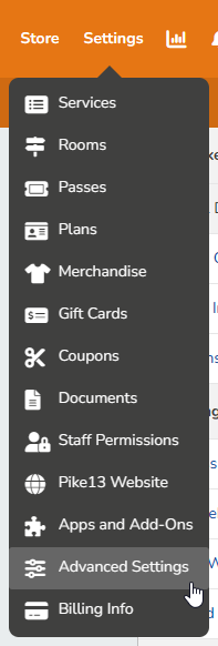 - At the top of any Pike13 page, select Settings > Advanced Settings.