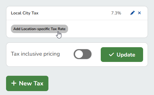 - If your business has additional locations with a different local tax rate, from the drop-down box choose the location for which you want to apply the separate tax rate, click Add Location-specific Tax Rate, select the location, enter the local tax rate, and then click Save.