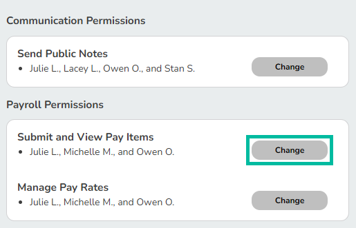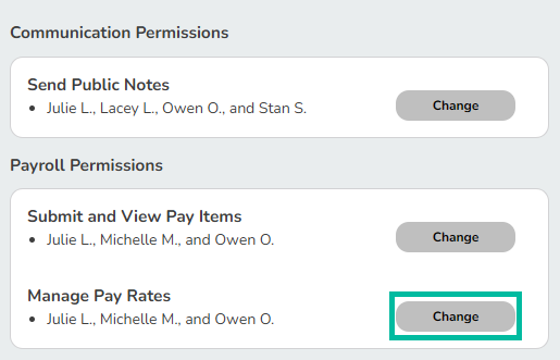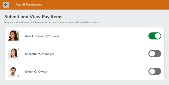 To give businesses more control, Owners and Primary Owners can configure which individual staff members can send public notes, add/mange pay rates, and add payroll items for a staff member.