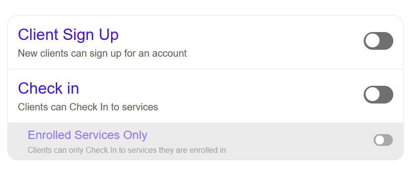 - Choose whether to allow new clients to sign up, current clients to check in, or allow only clients to check in to classes they are previously enrolled in or allow both new clients to sign up and allow clients to check in to scheduled services or only services they are already enrolled in.